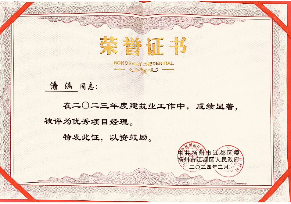 恭喜潘涵榮獲2023年度江都區(qū)優(yōu)秀項(xiàng)目經(jīng)理!...