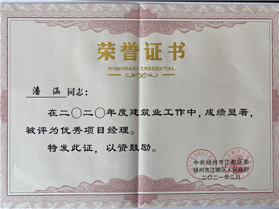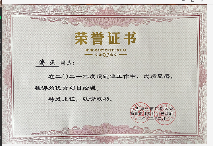 2023 02/15恭喜潘涵榮獲2022年度江都區(qū)優(yōu)秀項(xiàng)目經(jīng)理!