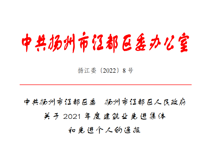 中共揚(yáng)州市江都區(qū)委辦公室 揚(yáng)江委〔2022〕8 號中共揚(yáng)州市江都區(qū)委 揚(yáng)州市江都區(qū)人民政府 關(guān)于 2021 年度建筑業(yè)先進(jìn)集體 和先進(jìn)個人的通報(bào) 各鎮(zhèn)黨委、政府,區(qū)各部委辦局,區(qū)各直屬單位: 2021 年...